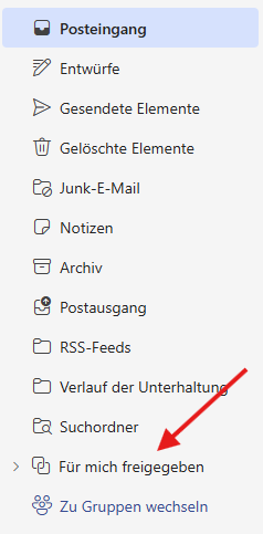 Diese befinden sich in Outlook (new) jetzt unterhalb des Ordners Für mich freigegeben. Dieser Ordner muss erst per Klick erweitert (aufgeblättert) werden: